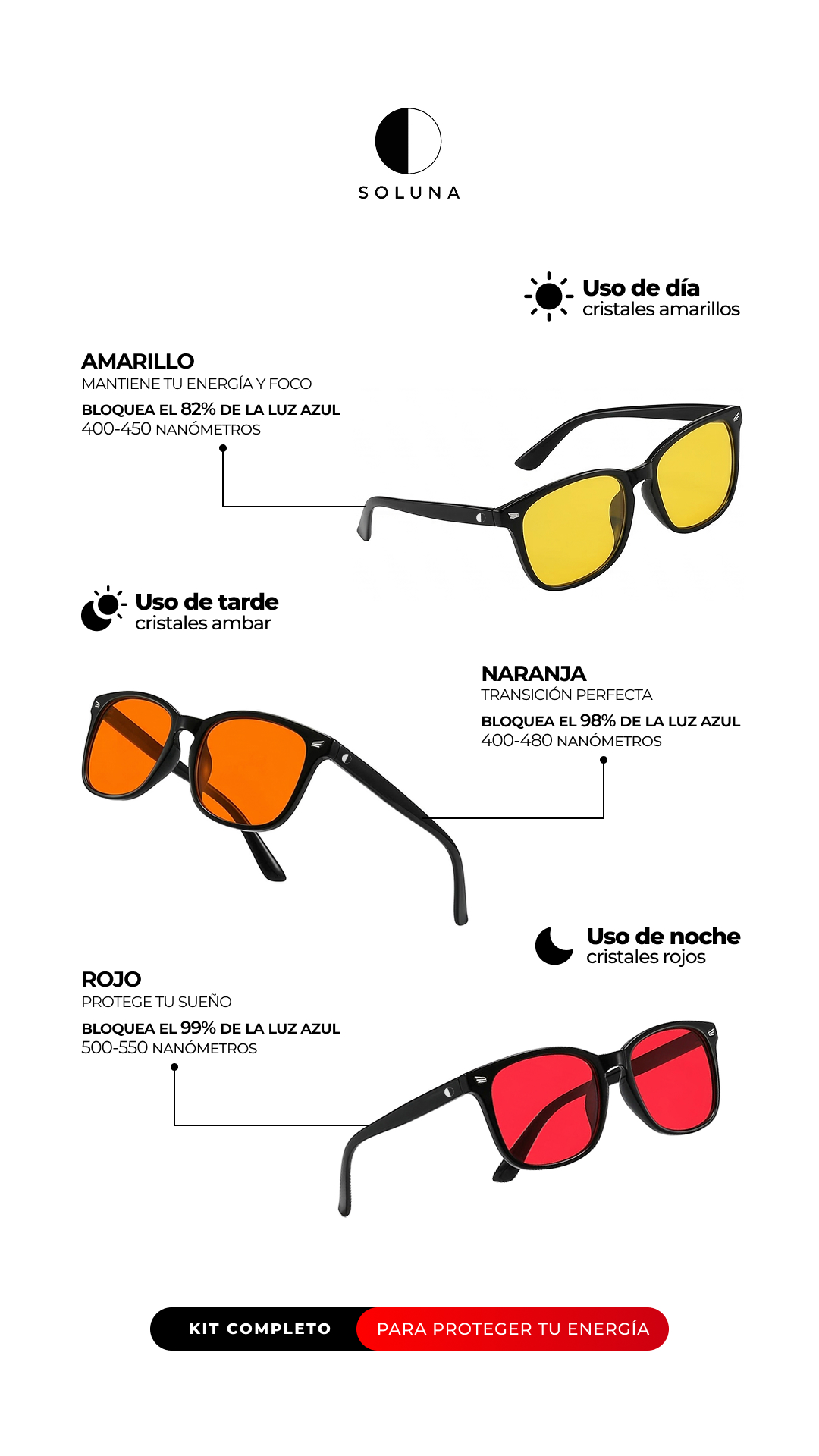 Los LENTES ANTI LUZ AZUL SOLUNA fueron diseñados para acompañar tu biología durante todo el día, con diferentes niveles de protección según el momento.